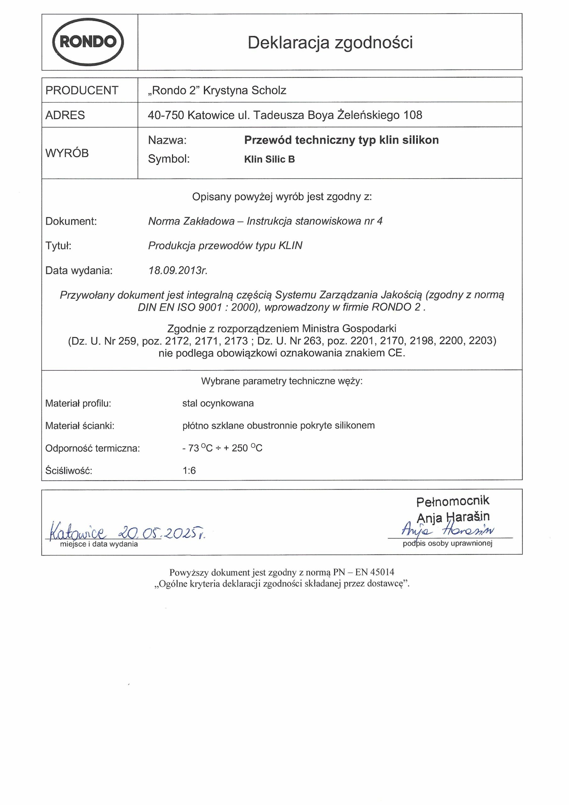 Tolerance for the parameters contained in this catalog is about 5%. All parameters apply for room temperature. To discharge static electricity, ground the spiral. It is possible to make a hose with a non‑standard diameter (not included in the basic offer) on a special request. It is possible to make a KLIN hose whether with galvanized spiral or stainless steel spiral for a special request. The standard lengths of the hoses are measured while maximum extension.